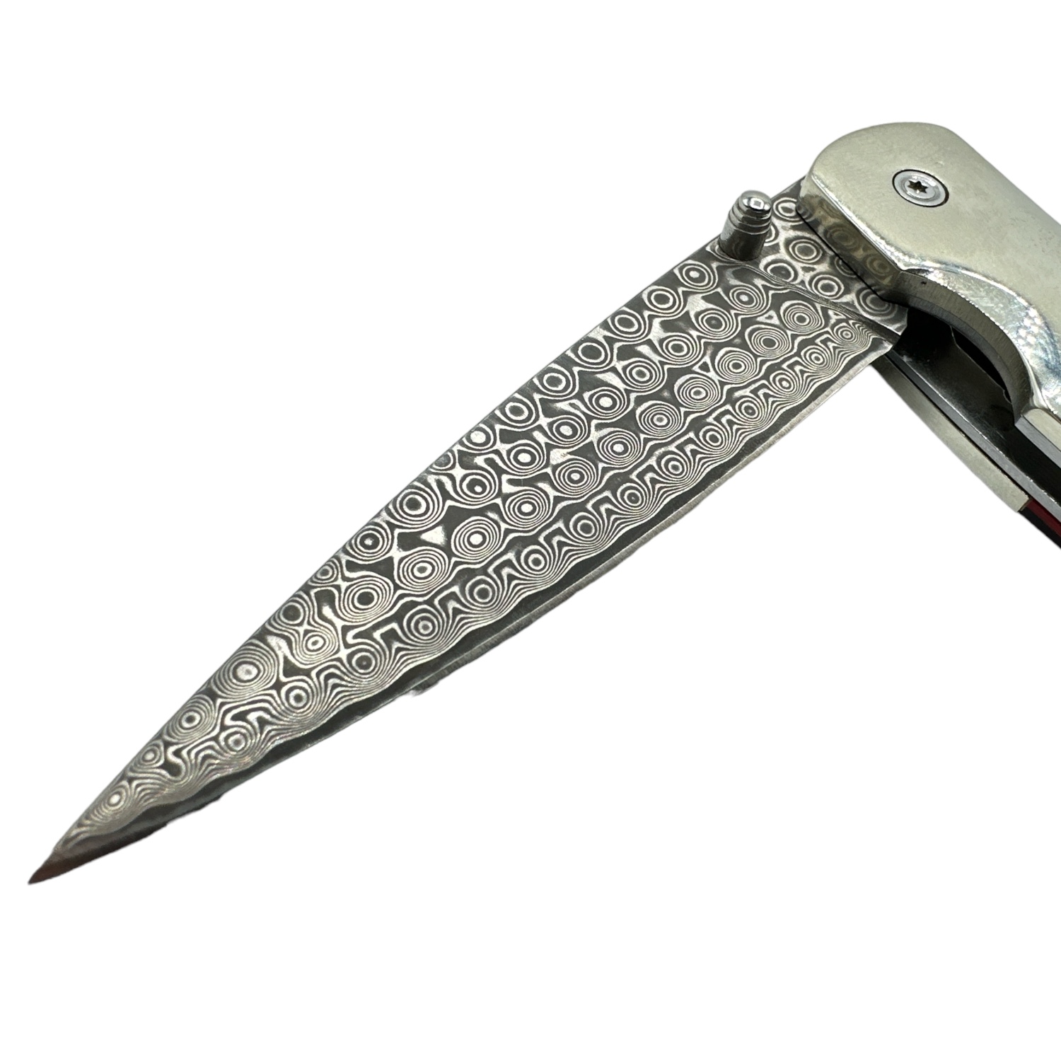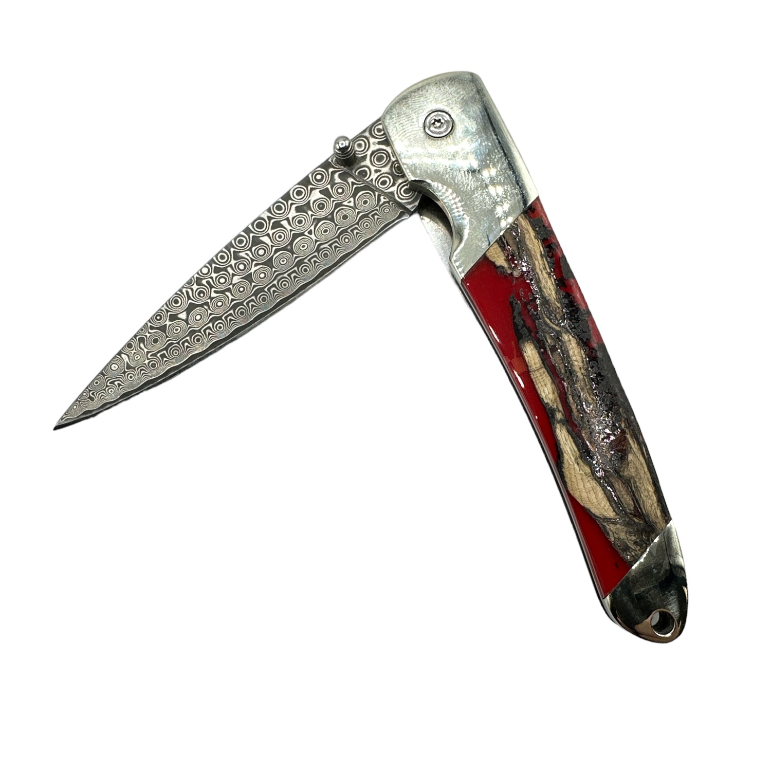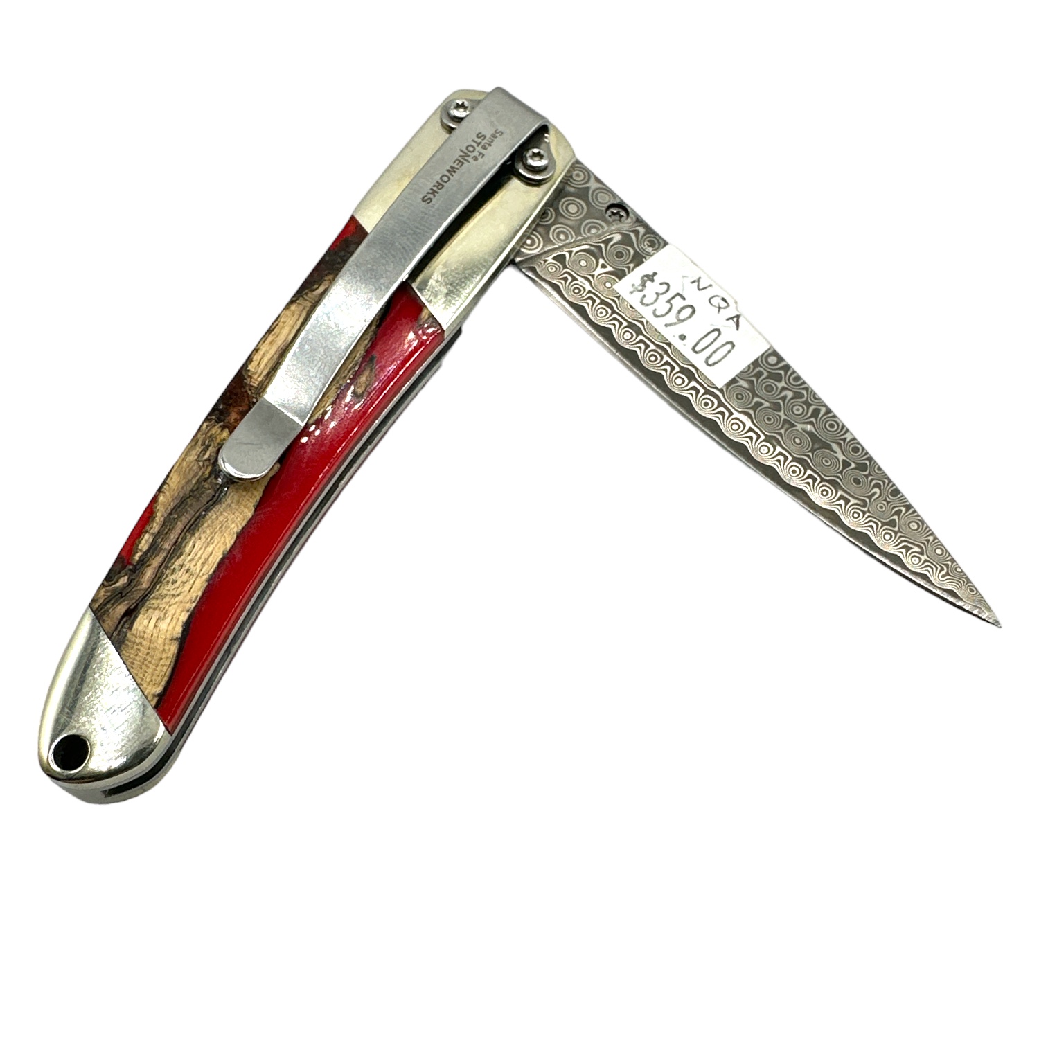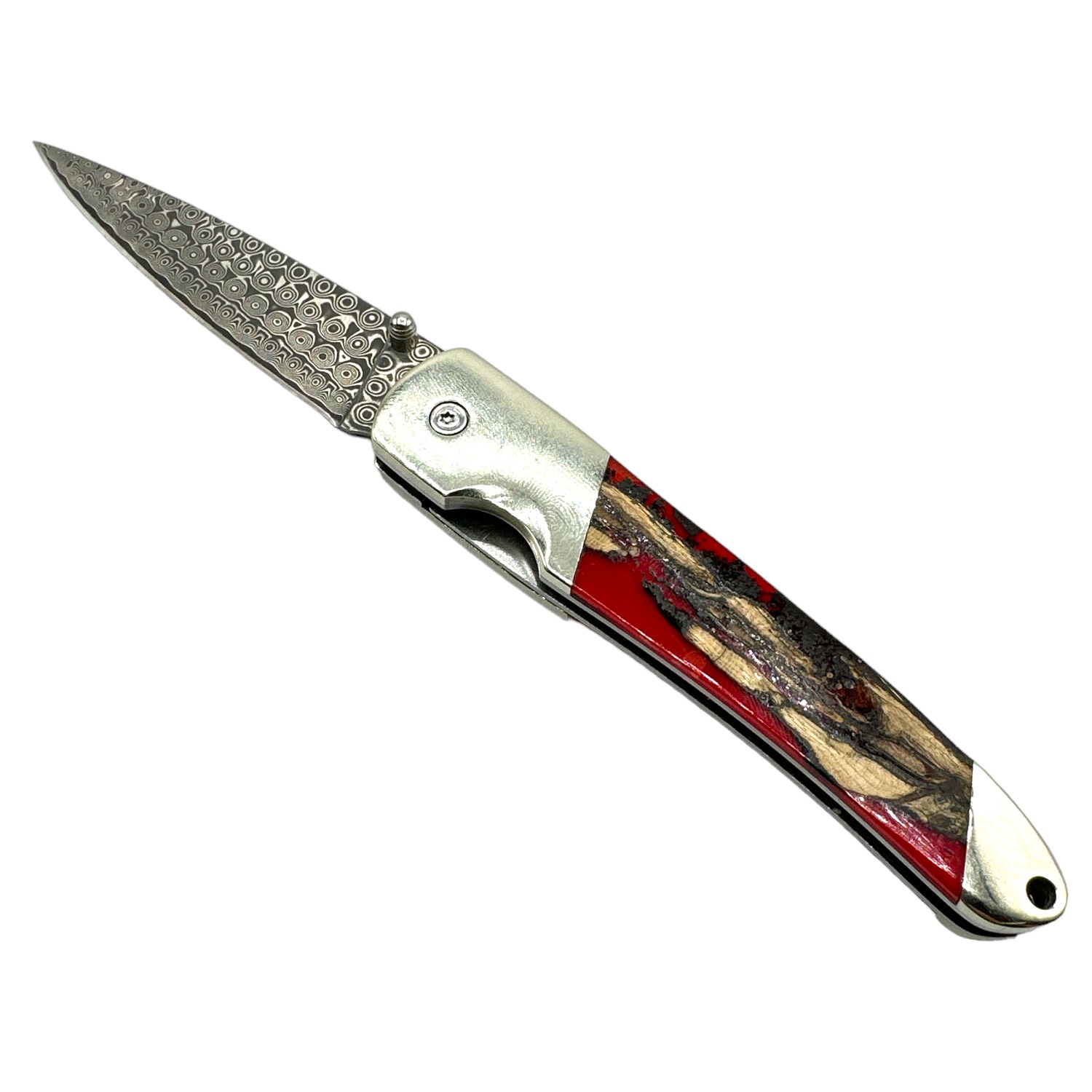 At 4″ closed, this nifty liner lock folding knife is small enough to conveniently fit in your pocket. It measures 7″ in overall length with the 3″ rainbow Damascus steel blade in the open locked position. The stainless steel frame/handle has been adorned with Cholla Cactus Stabilized in red Resin on both sides. It also has a pocket clip and convenient lanyard hole. It weighs a comfortable 97.3g.